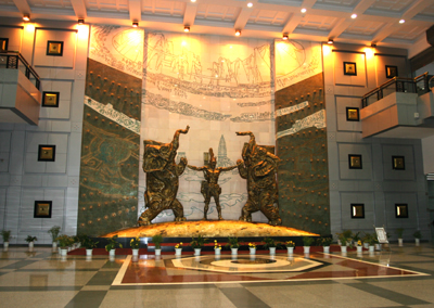 展廳門口聳立著的巨幅雕塑,表現(xiàn)古代一人牽?jī)上蟮那榫,這也是河南的簡(jiǎn)稱“豫”的由來(lái)。