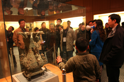 12月5日下午,聚焦中部話崛起采訪團(tuán)一行20多人,興致勃勃地參觀了位于鄭州市北的河南博物院。該院匯集石器、陶器、瓷器、青銅器、金銀器等精美文物2000余件,詳盡的展現(xiàn)了由以彩陶為代表的仰韶文化、春秋戰(zhàn)國(guó)青銅器文明以至明清陶瓷藝術(shù)的河南古代文化發(fā)展脈絡(luò)。徜徉在這座文物的大觀園里,記者們對(duì)中華民族悠久燦爛的古代文明發(fā)出由衷的贊嘆。(荊楚網(wǎng)記者 王淳攝)