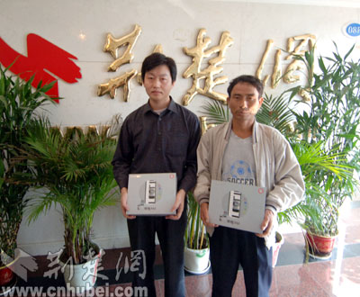荊楚網(wǎng)24日訊 記者艾丹 潘頔 報(bào)道:23日抽出的“讀報(bào)紙、發(fā)短信、中手機(jī)”活動(dòng)的兩位幸運(yùn)獲獎(jiǎng)?wù),武漢的李先生和谷城的孟先生,今天下午來到荊楚網(wǎng)領(lǐng)獎(jiǎng),荊楚網(wǎng)總編輯閻思甜親自為他們頒獎(jiǎng)。