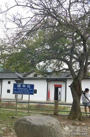 舊居坐落在大井村中央,因墻壁為白色,慣稱它為"白屋"。這棟房子共有44間,五個天井,面積近千平方米。毛澤東率領(lǐng)工農(nóng)紅軍首次到達(dá)大井時就住在這里,此后便成為毛澤東在大井的住地。1929年1月底,這棟房子被敵人燒毀,僅剩下一堵殘墻、屋后的兩棵樹和房前草坪上的一塊大石頭。1960年,當(dāng)?shù)卣丛残迯?fù),將殘墻嵌入新墻之中作為紀(jì)念。屋前的有塊大石頭因毛澤東時常坐在上面看書讀報(bào)、批閱文件,被人稱為“讀書石”。