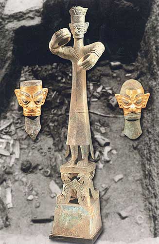 青銅金面人頭像:推測為神像(左,高42.5厘米)