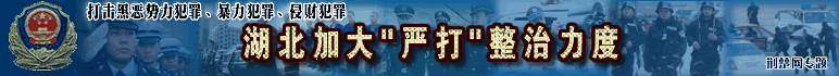 湖北今年嚴(yán)打目標(biāo)確定 省公安廳透露,去冬今春,我省社會治安大局穩(wěn)定,刑事發(fā)案率有所下降,今年將加大嚴(yán)打整治力度,重點打擊黑惡勢力犯罪、暴力犯罪、侵財犯罪……[詳細]::武漢警方突襲濱江明珠娛樂城 抓獲45名吸毒者 ::全省交警嚴(yán)查盜搶車 一假警車上查處9塊假車牌::湖北圈定106個治安整治重點 武漢市5個地段在列 武漢嚴(yán)打建筑工地惡勢力 [市政法委 各區(qū)舉報電話][把黑惡勢力趕出工地訪談熱線開通]::武漢市政法委副書記:廣泛發(fā)動群眾鏟除沙霸石霸::漢陽鏟除沙石惡霸團伙 行兇兩年作惡無數(shù)(圖)