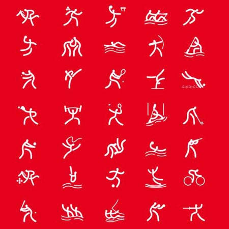 北京奧運會體育圖標設計包括35個圖標,分別是田徑、賽艇、羽毛球、棒球、籃球、拳擊、皮筏艇(靜水)、皮筏艇(激流)、自行車、馬術、擊劍、足球、體操、藝術體操、蹦床、舉重、手球、曲棍球、柔道、摔跤、游泳、花樣游泳、跳水、水球、現(xiàn)代五項、壘球、跆拳道、網(wǎng)球、乒乓球、射擊、射箭、鐵人三項、帆船、排球和沙灘排球。