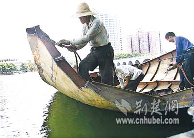 “船太大了,沒辦法運(yùn)出城,只好進(jìn)行分解后運(yùn)走!必(fù)責(zé)現(xiàn)場施工的馬先生解釋,2002年初,他所在的公司承攬東湖清淤工程,共運(yùn)來8條清淤船,其中一條船放置在水果湖。當(dāng)時(shí),經(jīng)有關(guān)部門批準(zhǔn),這些船由大型車輛運(yùn)來并吊入湖中。目前清淤工程結(jié)束,湖中的船不好運(yùn)走,只好割成一塊塊鋼板,當(dāng)成廢鋼賣掉。