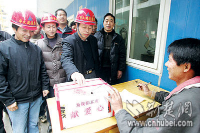 工友們悄悄謀劃開了。昨日上午,在施工現(xiàn)場,大家你100、我50地將錢投進(jìn)捐款箱。一個(gè)多小時(shí)內(nèi),共捐款3460元。