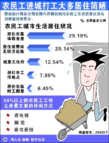 雖然生活條件普遍較差,勞動強度大,社會保障差,文化娛樂少,但多數(shù)農(nóng)民工仍然認可目前在城市的生存現(xiàn)狀,對未來生活充滿希望。國家統(tǒng)計局25日發(fā)布的一項調(diào)查結(jié)果中這樣說。