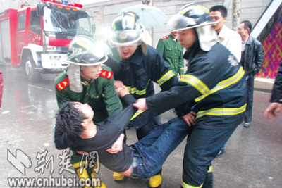 昨日上午,漢口青島路10號的鉆石酒吧在裝修中不慎引發(fā)火災,兩男子被困。危急關(guān)頭,消防兵破門而入,將二人救出。