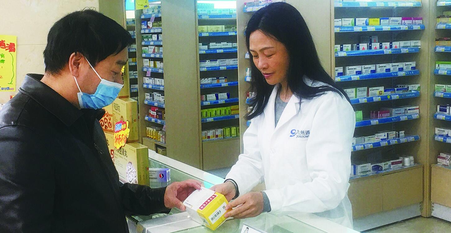 圖為昂明嶸(右)為顧客講解用藥注意事項(xiàng)。