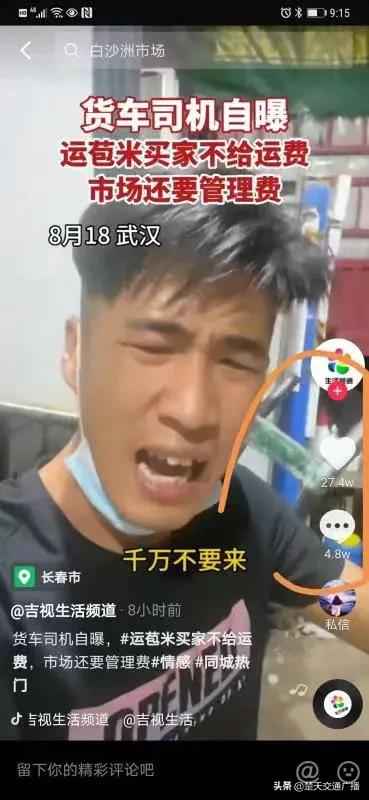 8月18日至19日,網(wǎng)民在網(wǎng)上發(fā)布多條反映“貨車司機自曝運玉米買家不給運費市場還要管理費”的抖音視頻,視頻中一名青年男子口述,其投訴對象為武漢白沙洲大市場。