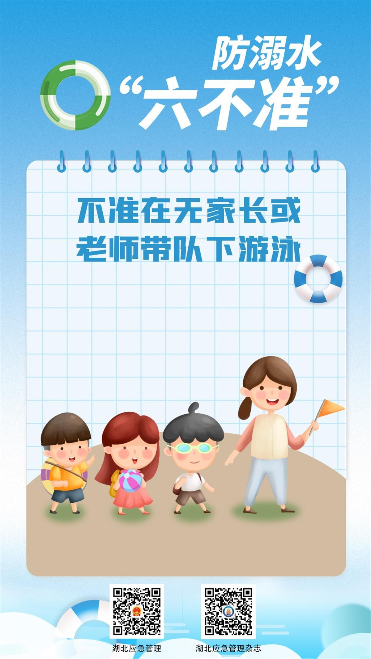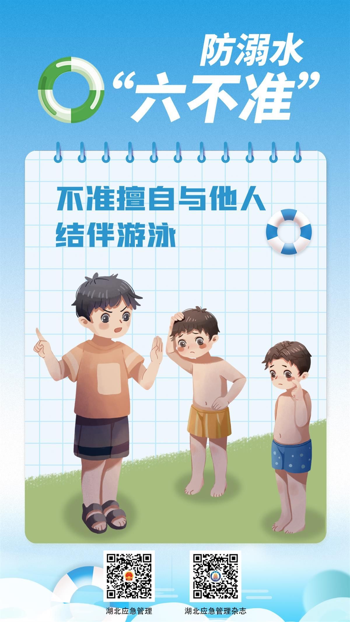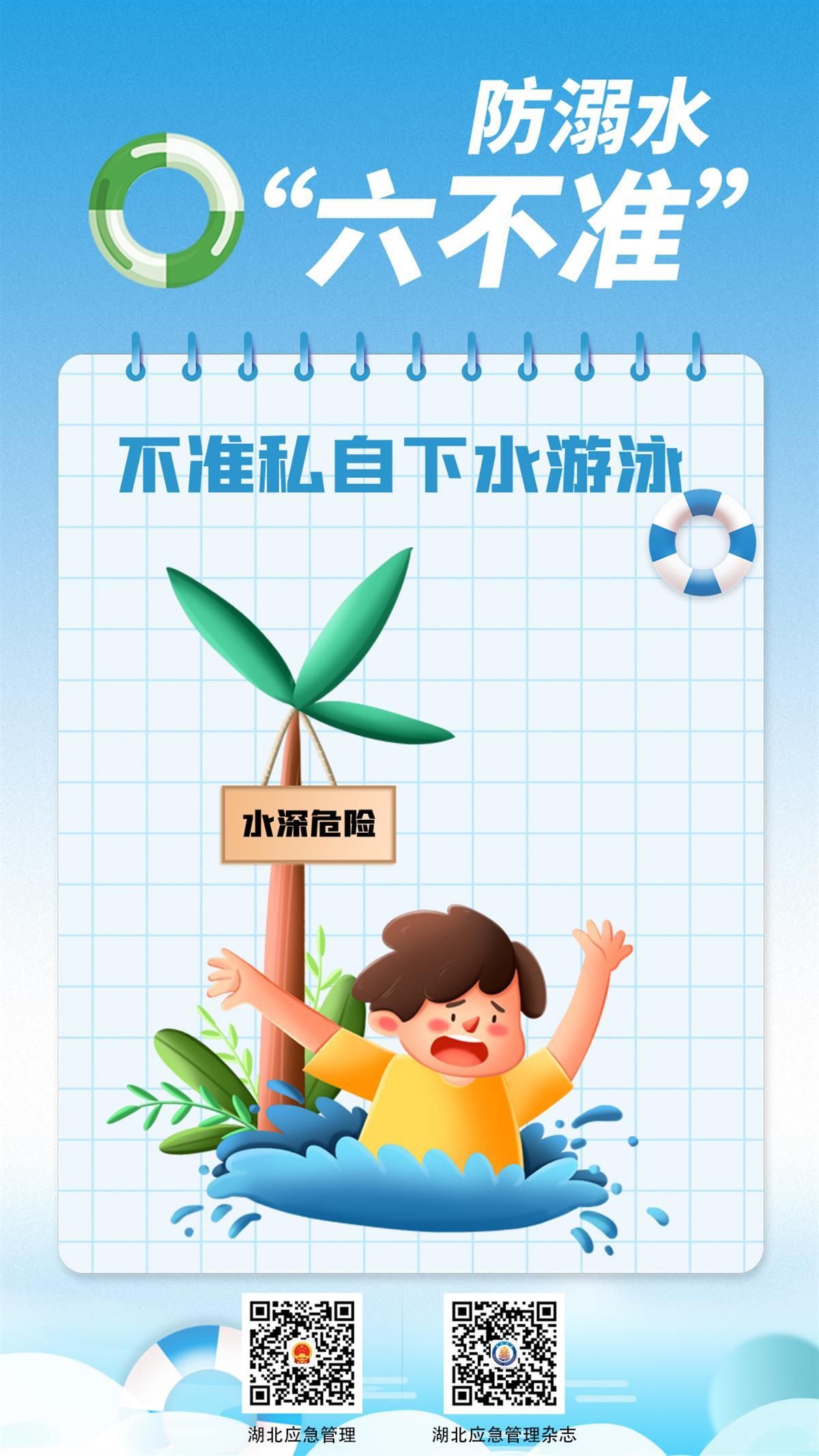 如何避免悲劇發(fā)生?7月8日,湖北省應(yīng)急管理廳發(fā)布系列海報(bào),提醒學(xué)生防溺水應(yīng)做到“六不準(zhǔn)”:不準(zhǔn)私自下水游泳;不準(zhǔn)擅自與他人結(jié)伴游泳;不準(zhǔn)在無(wú)家長(zhǎng)或教師帶領(lǐng)的情況下游泳;不準(zhǔn)到無(wú)安全設(shè)施、無(wú)救援人員的水域游泳;不準(zhǔn)到不熟悉的水域游泳;不準(zhǔn)未成年人擅自下水施救。