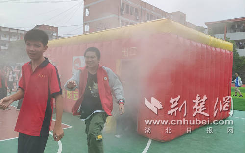 “發(fā)生火災后,正確佩戴面罩,會為逃生贏得寶貴時機,但戴面罩時一定要記得取掉蓋子,確保能正常呼吸?!?3日上午,防災減災科普主題“應急演練”在馬港中學操場開展。當天8時30分許,應急演練活動正式開始,該校100多名中學生圍著操場站成一圈,與來自無憂熊安全教育機構的老師們現(xiàn)場互動熱身。通過老師講解應急包、滅火器的使用,模擬火災后如何穿越濃煙逃生等等,學生進一步了解了安全應急知識,并學會正確使用、佩戴安全裝備。