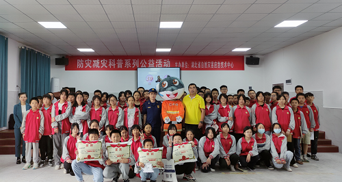 湖北省自然災害應急技術中心為300余名師生送上防災減災科普系列活動的同時,還捐贈了應急科普叢書、應急包、文具套裝等物資。