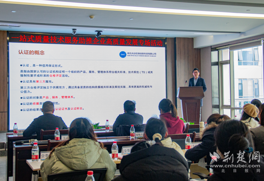“標(biāo)準(zhǔn)對于規(guī)范企業(yè)發(fā)展非常重要,而認(rèn)證對于企業(yè)開展市場交易活動的作用也很關(guān)鍵“,湖北光谷標(biāo)準(zhǔn)創(chuàng)新科技有限公司認(rèn)證事業(yè)部負(fù)責(zé)人余毅向與會企業(yè)代表普及了《認(rèn)證基礎(chǔ)知識》。他表示,認(rèn)證起源于市場、服務(wù)于市場、發(fā)展于市場,廣泛存在于產(chǎn)品和服務(wù)等市場交易活動之中,能夠在市場中傳遞權(quán)威可靠信息,建立市場信任機制,引導(dǎo)市場優(yōu)勝劣汰。市場主體采用認(rèn)證手段,可以實現(xiàn)互信互認(rèn),打破市場和行業(yè)壁壘,促進(jìn)貿(mào)易便利化,減少制度性交易成本。隨后,他詳細(xì)介紹了認(rèn)證工作的各項流程,并表示企業(yè)如果有需要,光標(biāo)公司可以圍繞認(rèn)證提供全方位服務(wù)。