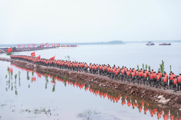 長江防汛搶險綜合演練現(xiàn)場,武警官兵前往險情位置進(jìn)行處置。