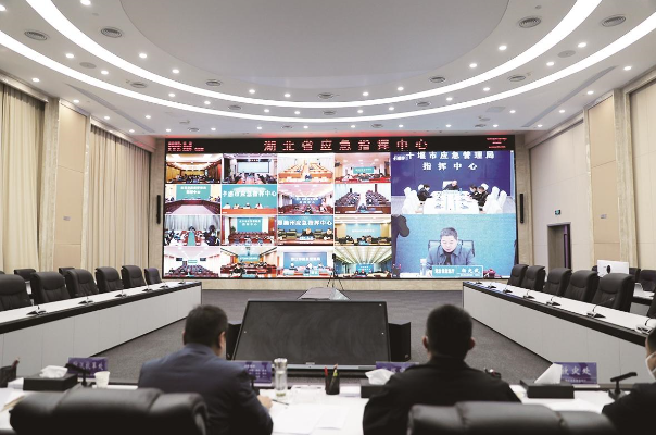 湖北省應(yīng)急管理廳應(yīng)急指揮中心,通過視頻連線各級應(yīng)急指揮中心和救援隊伍。