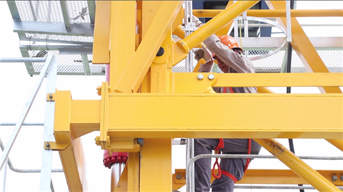 檢驗(yàn)現(xiàn)場(chǎng),檢驗(yàn)員們?nèi)蔽溲b,戴上安全帽,系好安全繩,沿著狹窄的爬梯,往塔吊頂端攀爬著。在檢驗(yàn)過(guò)程中,檢驗(yàn)員嚴(yán)格按照《起重機(jī)械定期檢驗(yàn)規(guī)則》要求,依次開展了技術(shù)資料審查、作業(yè)環(huán)境和外觀檢查、金屬結(jié)構(gòu)檢查、主要零部件檢驗(yàn)、安全保護(hù)和防護(hù)裝置檢查、液壓系統(tǒng)檢查、司機(jī)室檢查、電氣檢查、性能試驗(yàn)等項(xiàng)目的檢驗(yàn)工作。整個(gè)塔吊的檢驗(yàn)歷經(jīng)了2個(gè)多小時(shí)。
