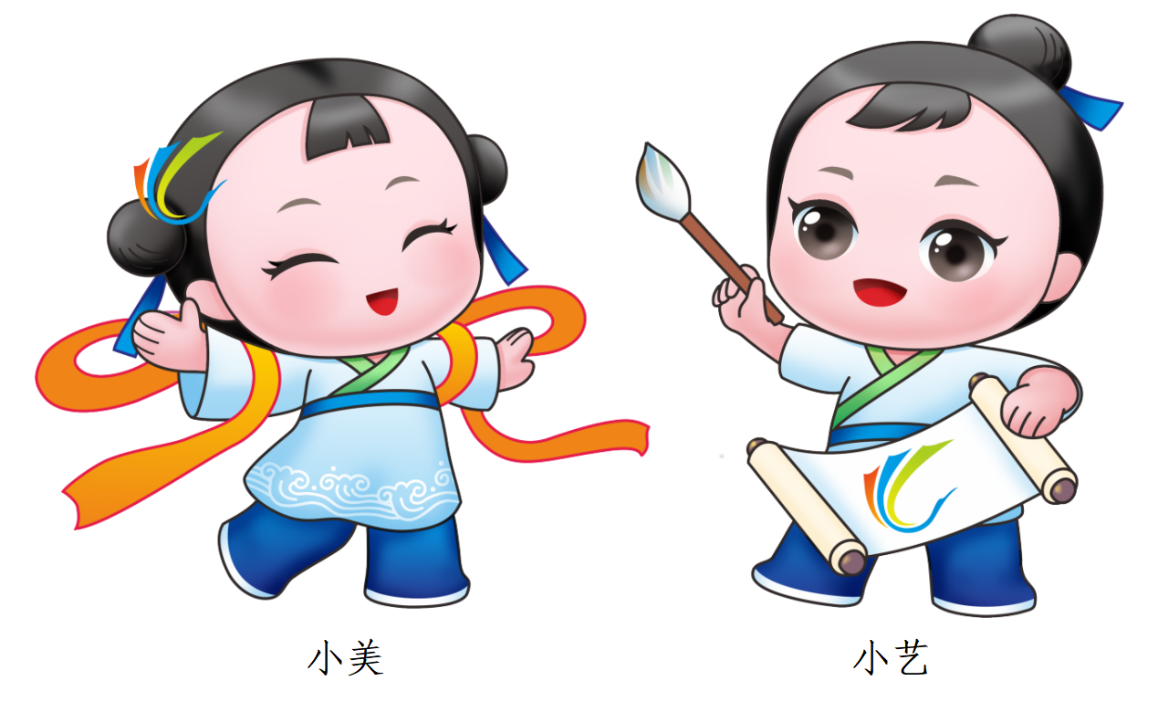 主體視覺(jué)以“創(chuàng)意與活力,藝術(shù)與青春”為設(shè)計(jì)理念,景泰藍(lán)為主色調(diào),配合多彩的美育節(jié)圖案,給人以熱烈、活潑、靈動(dòng)、藝術(shù)的視覺(jué)感受,以表達(dá)青春的活力和藝術(shù)的多樣性??ㄍㄐ蜗蠹槲锩Q(chēng)為小藝和小美,以大孝子董永與七仙女為設(shè)計(jì)原型,彰顯中國(guó)孝文化之鄉(xiāng)的美名。“小美”佩戴美育節(jié)頭飾,舞帶是七仙女的織衣,象征著美育節(jié)表演項(xiàng)目的神奇創(chuàng)造力?!靶∷嚒笔治彰P宣紙,展現(xiàn)人文特色,象征藝術(shù)作品的非凡表現(xiàn)力。