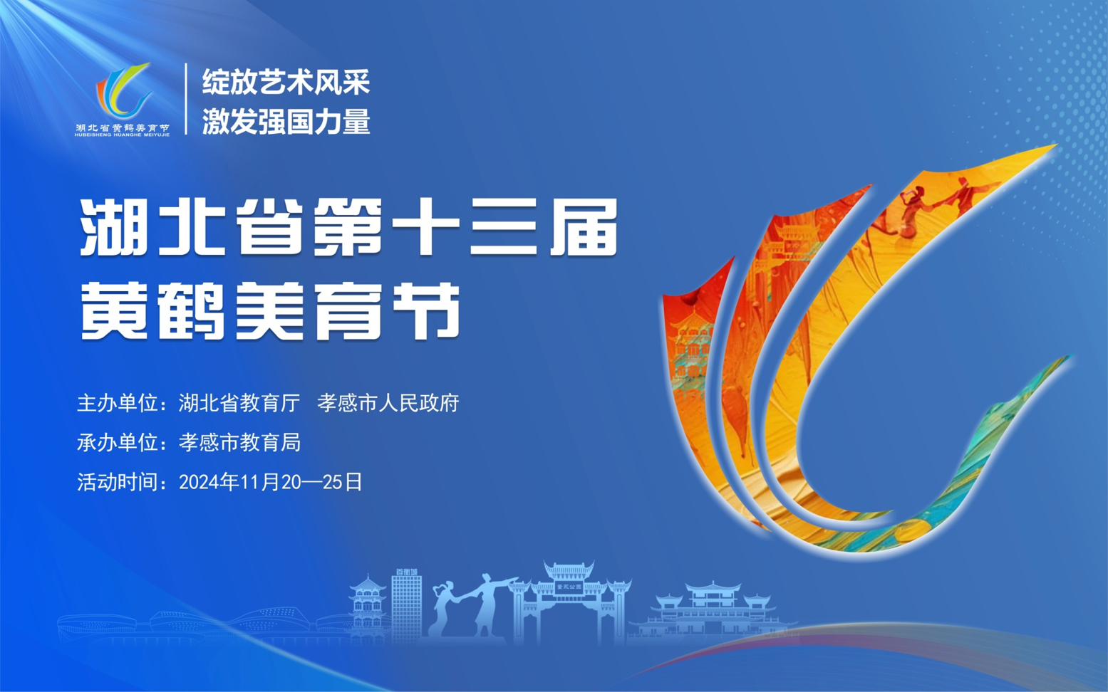 第十三屆黃鶴美育節(jié)以“綻放藝術(shù)風(fēng)采 激發(fā)強(qiáng)國(guó)力量”為主題,分各校、縣(市、區(qū))、市(州)活動(dòng)、省級(jí)集中展演和全國(guó)現(xiàn)場(chǎng)展演三個(gè)階段開(kāi)展。2024年11月20日至11月25日在孝感集中舉行黃鶴美育節(jié)開(kāi)閉幕式和現(xiàn)場(chǎng)展演,共有來(lái)自全省17個(gè)市(州)中小學(xué)校、6000余名師生參加活動(dòng),1300余件作品進(jìn)行展示。