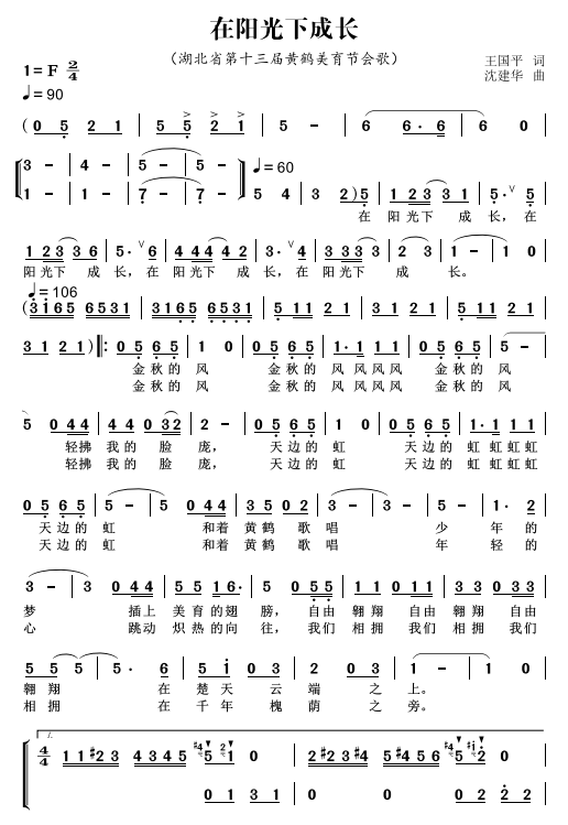 會(huì)歌《在陽(yáng)光下成長(zhǎng)》歌詞通俗、簡(jiǎn)潔明了,獨(dú)具個(gè)性的標(biāo)題“在陽(yáng)光下成長(zhǎng)”不但凸顯了湖北省黃鶴美育節(jié)活動(dòng)的核心主題,同時(shí)也形象地表現(xiàn)了在黨的陽(yáng)光照耀下少年兒童追求夢(mèng)想、崇尚藝術(shù)、快樂(lè)成長(zhǎng)的精神風(fēng)貌。