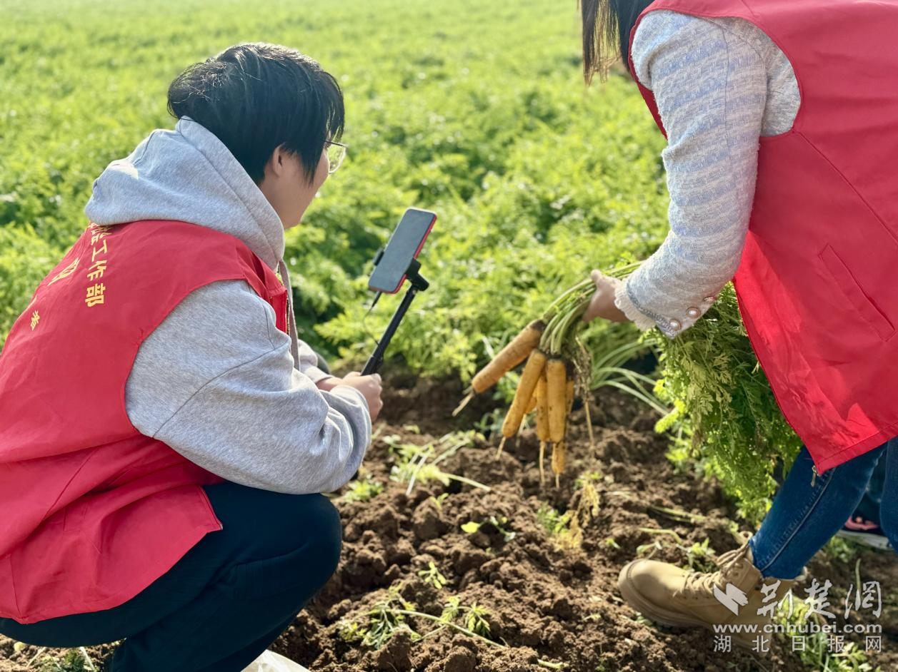 “我們現(xiàn)在所處的位置是應(yīng)城市城中街道周陳村,這是剛剛從田里挖出來(lái)的胡蘿卜,天然無(wú)污染!”直播鏡頭前,一壟壟“黃玉”胡蘿卜長(zhǎng)勢(shì)喜人,主播們現(xiàn)場(chǎng)采摘、試吃,向直播間的網(wǎng)友們介紹胡蘿卜的品質(zhì)和口感。