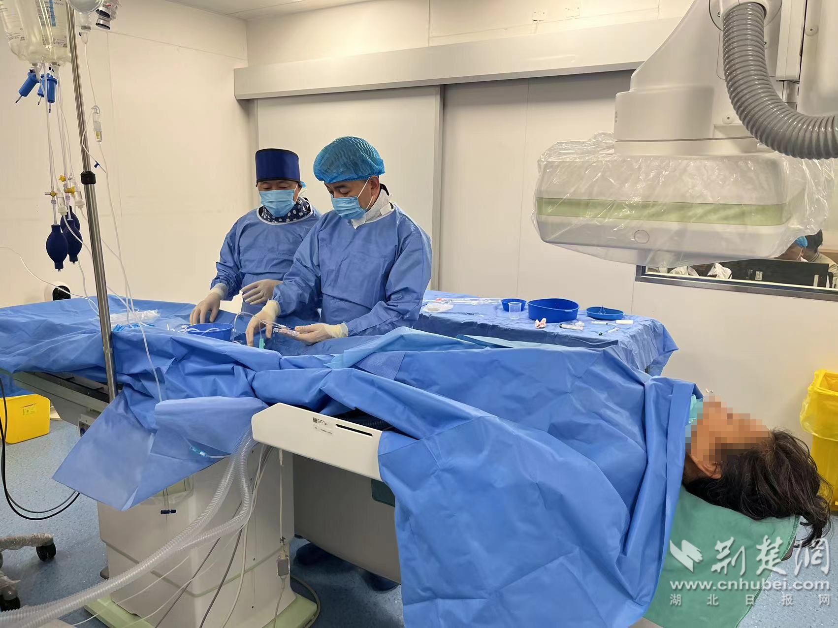 12月11日,66歲的徐女士在家中突發(fā)頭痛、頭昏、乏力,右側(cè)肢體無力,并伴有多次惡心嘔吐,暈倒在地后,被家人撥打120緊急送入孝感市中醫(yī)醫(yī)院。檢查顯示蛛網(wǎng)膜下腔出血,急診以大腦中動脈瘤破裂伴蛛網(wǎng)膜下腔出血收入外一科住院?;颊唠S時可能病情惡化,導(dǎo)致腦疝、遲發(fā)性腦出血、癲癇、急性心肌梗死、肺栓塞、應(yīng)激性潰瘍急性腦梗塞、惡性心律失常、多器官功能不全甚至心臟驟停等危險。ICU主任沈傳運和神經(jīng)外科主任顏學(xué)槐會診后,徐女士被轉(zhuǎn)入ICU進行重癥監(jiān)護支持治療。與此同時,孝感市中醫(yī)醫(yī)院通過醫(yī)聯(lián)體,邀請武漢市第一醫(yī)院羅明教授星夜馳援。