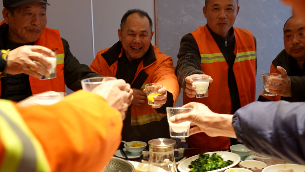 飯桌上,這場有說有笑的年飯,滿是人間煙火氣。樸實(shí)的環(huán)衛(wèi)工人們相互祝福、舉杯歡慶,你為我添飲料,我為你夾菜,溫馨的場景讓人動(dòng)容。他們在享受這份溫暖的同時(shí),也心懷感恩。