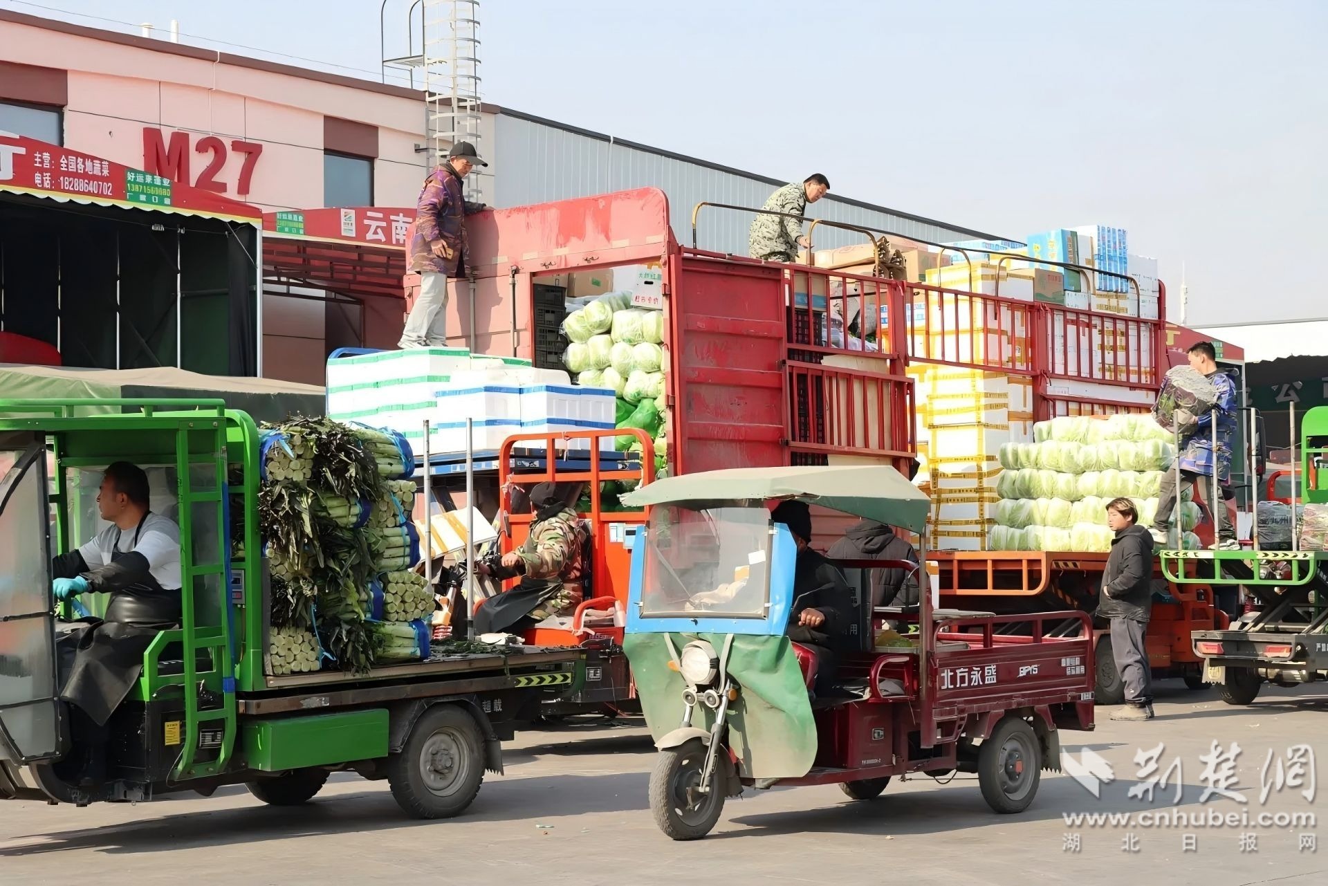 寒冬臘月,大棚蔬菜大量上新,市場上蓮藕、玉米、白蘿卜等品類暢銷。在蔬菜交易區(qū),前來采購的大小貨車川流不息,各蔬菜批發(fā)檔口、攤位交易繁忙。