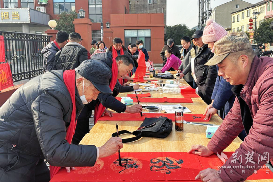 荊楚網(wǎng)(湖北日報網(wǎng))訊(記者黃菲、李好 通訊員李健初、鄒圓圓)龍騰四海辭舊歲,蛇舞九洲賀新春。蛇年春節(jié)前夕,走進孝昌縣花西鄉(xiāng),鎮(zhèn)區(qū)主街一側(cè)格外熱鬧,案臺上紅火的春聯(lián)紙鋪陳開來,來自孝昌縣書法協(xié)會的老師們正挽袖書作,寫字的筆走游龍、一氣呵成,作畫的下筆有神、栩栩如生,傳遞著美好的新春祝愿。