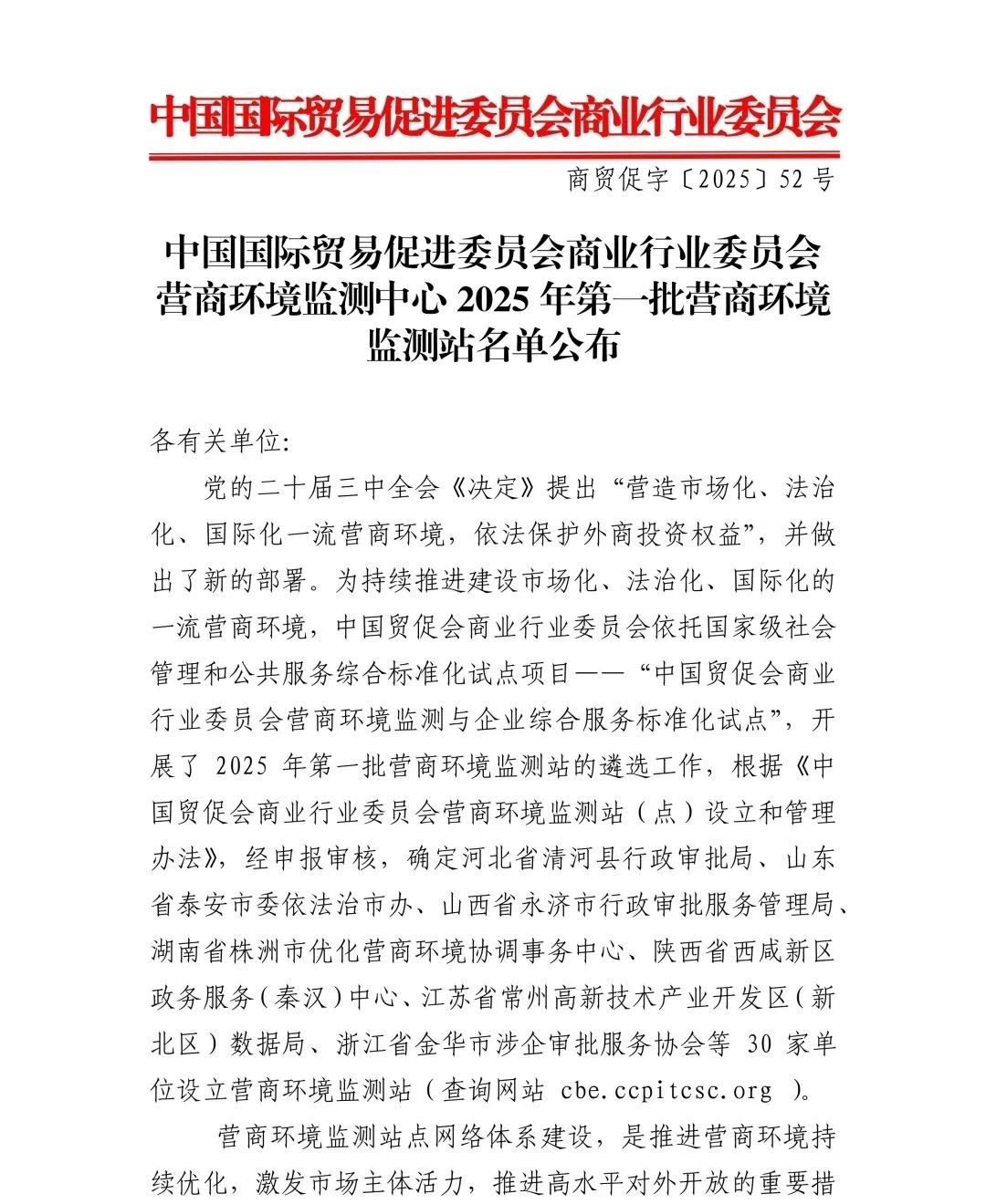 為持續(xù)推進(jìn)建設(shè)市場(chǎng)化、法治化、國(guó)際化的一流營(yíng)商環(huán)境,中國(guó)貿(mào)促會(huì)商業(yè)行業(yè)委員會(huì)依托國(guó)家級(jí)社會(huì)管理和公共服務(wù)綜合標(biāo)準(zhǔn)化試點(diǎn)項(xiàng)目——“中國(guó)貿(mào)促會(huì)商業(yè)行業(yè)委員會(huì)營(yíng)商環(huán)境監(jiān)測(cè)與企業(yè)綜合服務(wù)標(biāo)準(zhǔn)化試點(diǎn)”,開(kāi)展了2025年第一批營(yíng)商環(huán)境監(jiān)測(cè)站的遴選工作,根據(jù)《中國(guó)貿(mào)促會(huì)商業(yè)行業(yè)委員會(huì)營(yíng)商環(huán)境監(jiān)測(cè)站(點(diǎn))設(shè)立和管理辦法》,經(jīng)申報(bào)審核,確定湖北省孝感市孝南區(qū)營(yíng)商環(huán)境促進(jìn)中心、河北省清河縣行政審批局、江蘇省常州高新技術(shù)產(chǎn)業(yè)開(kāi)發(fā)區(qū)(新北區(qū))數(shù)據(jù)局、浙江省金華市涉企審批服務(wù)協(xié)會(huì)等30家單位設(shè)立營(yíng)商環(huán)境監(jiān)測(cè)站。