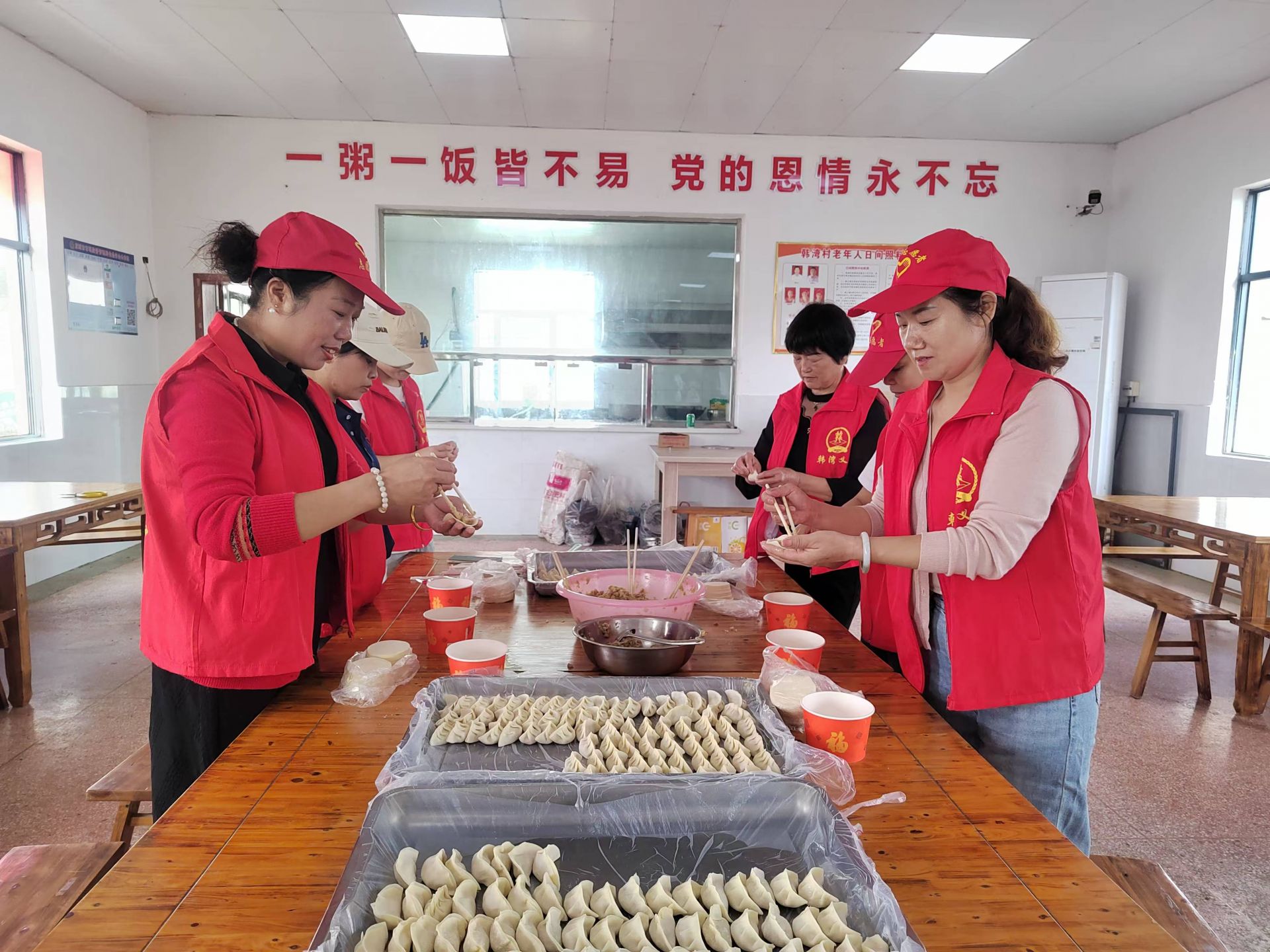 韓愛(ài)紅(右一)帶領(lǐng)志愿者為幸福食堂老人包餃子畫(huà)面。