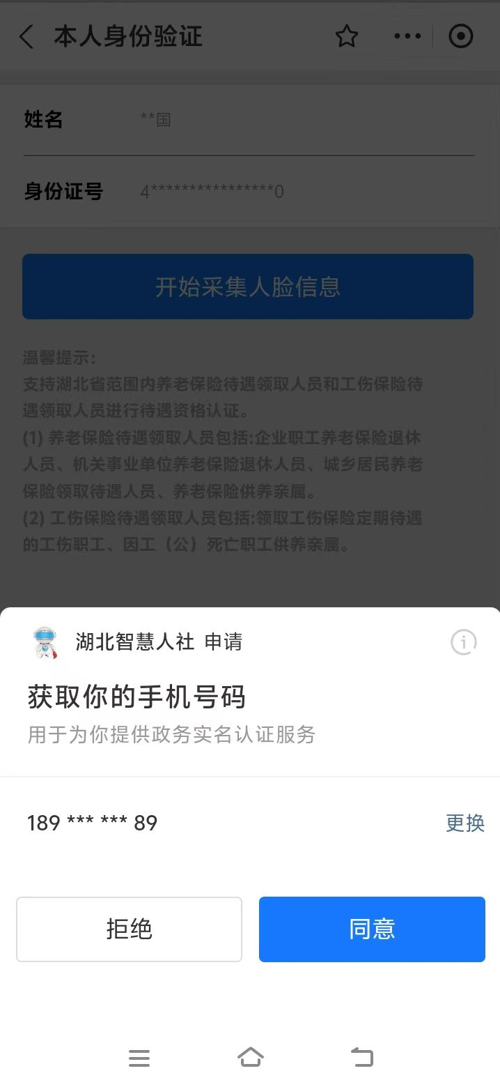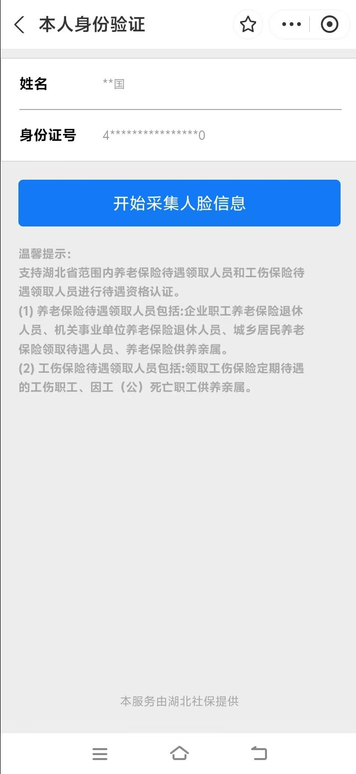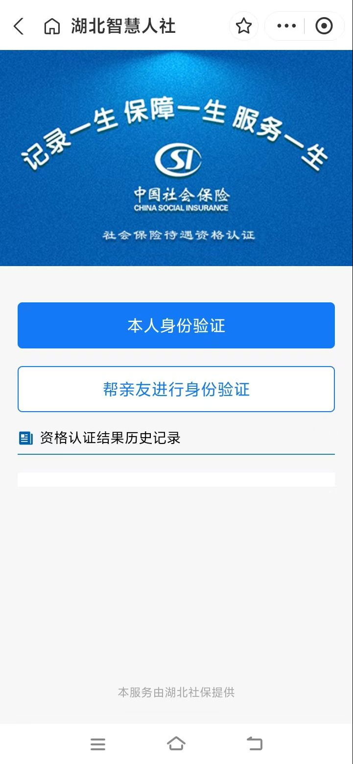 1.掃描上方二維碼后,跳轉(zhuǎn)進(jìn)入湖北省智慧人社界面,點(diǎn)擊“本人身份驗證”或者“幫親友進(jìn)行身份驗證”,填入“姓名”、“身份證號”,點(diǎn)擊“開始采集人臉信息”即可開始資格認(rèn)證。