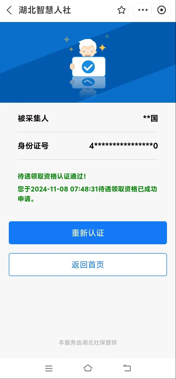 但需要提醒的是,從辦理待遇領(lǐng)取手續(xù)的次月起開始享受城鄉(xiāng)居保待遇,應(yīng)盡早辦理享待手續(xù)。開始領(lǐng)待后每年需進(jìn)行待遇資格認(rèn)證,12個月為一個認(rèn)證周期,參保人員可在上次認(rèn)證后的12個月內(nèi)任意選擇時間進(jìn)行認(rèn)證,未及時認(rèn)證的社保經(jīng)辦機(jī)構(gòu)將暫停待遇發(fā)放,認(rèn)證完成后進(jìn)行待遇補(bǔ)發(fā)。參保人員可通過“湖北12333”微信公眾號和“湖北智慧人社”支付寶小程序,線上自行操作認(rèn)證,也可到村(社區(qū))協(xié)助認(rèn)證或人社服務(wù)窗口線下人工認(rèn)證。