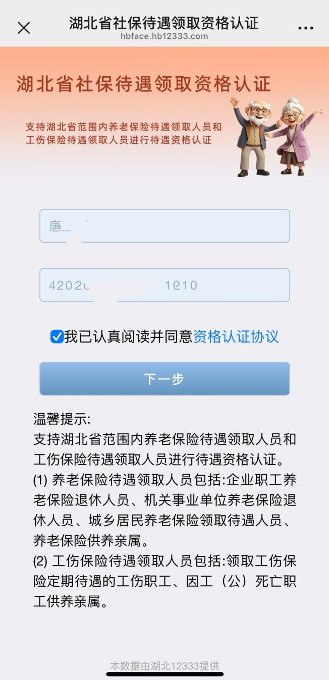 1.掃描上方二維碼后,跳轉(zhuǎn)進(jìn)入湖北省社保待遇領(lǐng)取認(rèn)證界面填入“姓名”、“身份證號”,點(diǎn)擊“下一步”即可開始資格認(rèn)證。