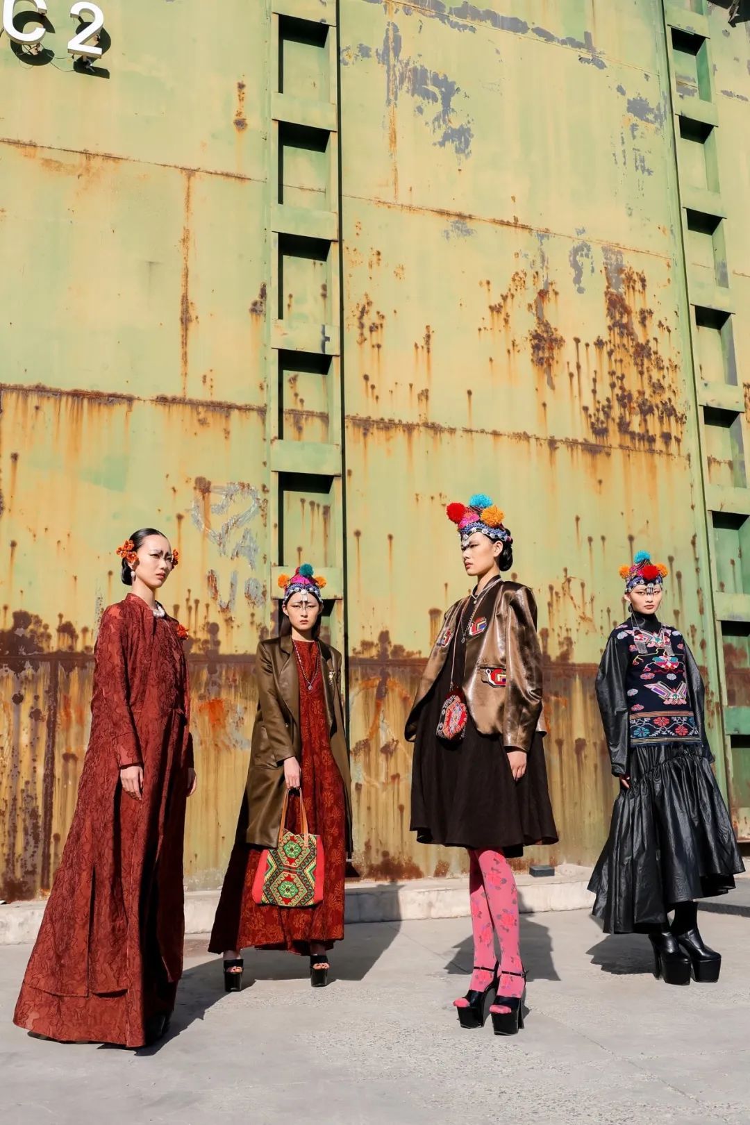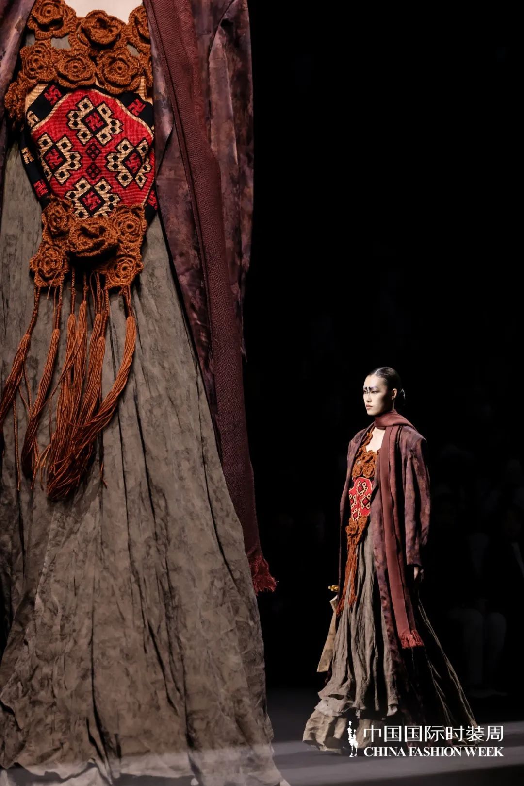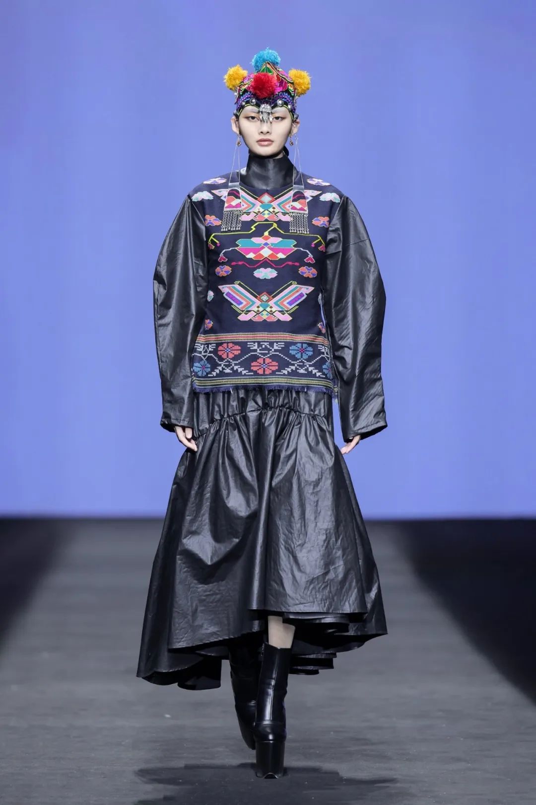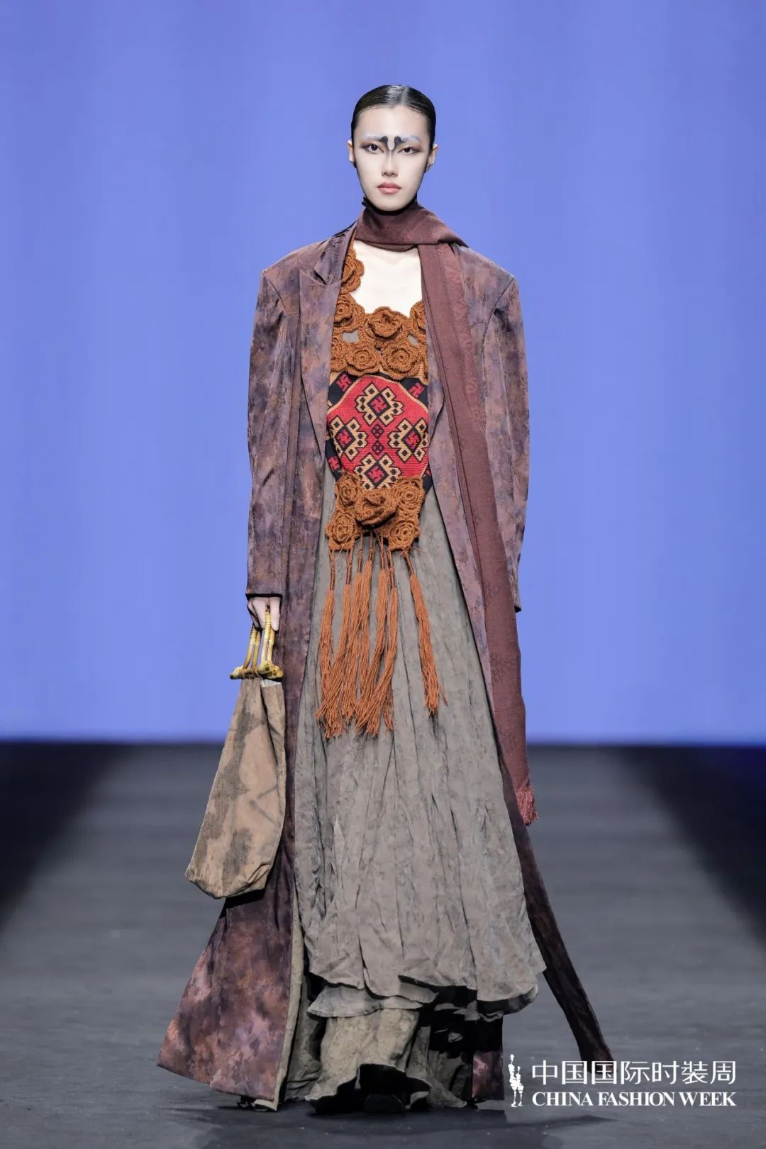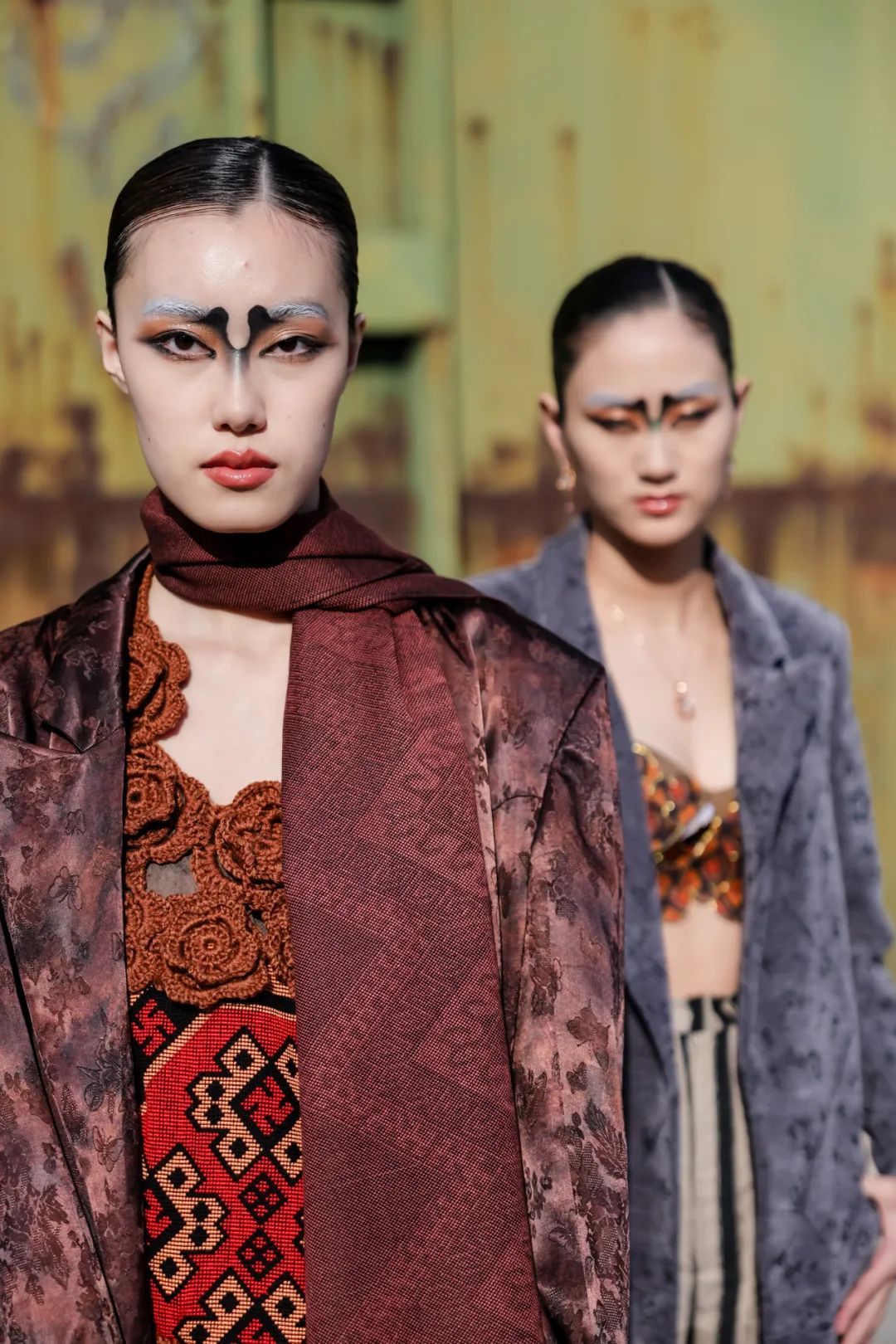 此次時裝周的核心設(shè)計團隊由中國十佳時裝設(shè)計師、中國紡織非遺推廣大使馮三三領(lǐng)銜。主創(chuàng)團隊從民間傳說中汲取靈感,巧妙地將西蘭卡普、香云紗、亮布等非物質(zhì)文化遺產(chǎn)面料與陽新布貼、絨花、苗繡等傳統(tǒng)手工藝相結(jié)合,讓古老的藝術(shù)煥發(fā)新生。