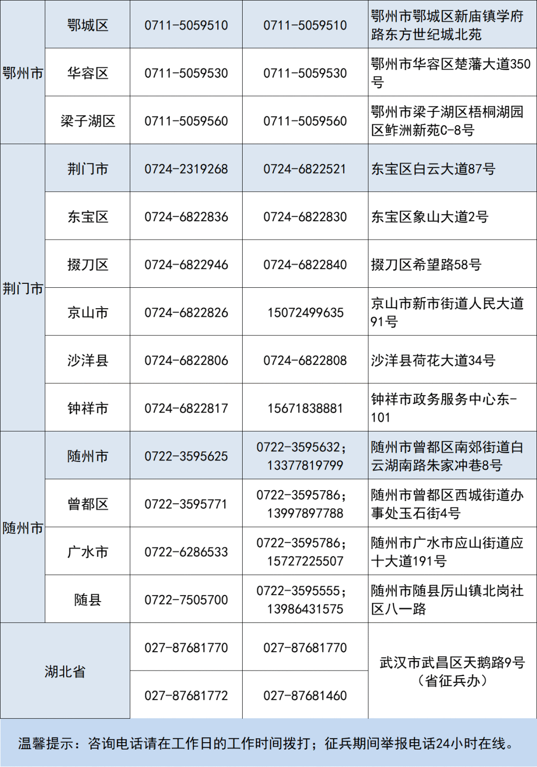 湖北省省市縣三級(jí)征兵工作咨詢舉報(bào)聯(lián)系方式