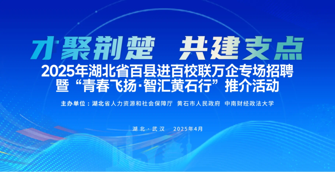 為深入實施“才聚荊楚”工程,湖北省人力資源和社會保障廳聯(lián)合黃石市人民政府、中南財經(jīng)政法大學擬于2025年4月19日(星期六)上午在中南財經(jīng)政法大學南湖校區(qū)舉辦“才聚荊楚·共建支點”—2025年湖北省百縣進百校聯(lián)萬企專場招聘暨“青春飛揚·智匯黃石行”推介活動。