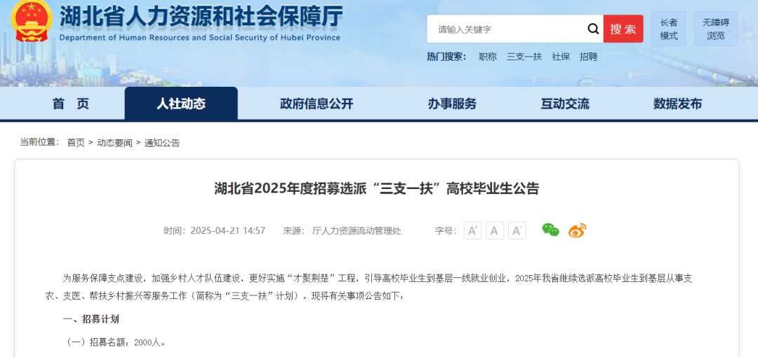 4月21日,湖北省“三支一扶”工作協(xié)調(diào)管理辦公室發(fā)布湖北省2025年度招募選派“三支一扶”高校畢業(yè)生公告,具體如下: