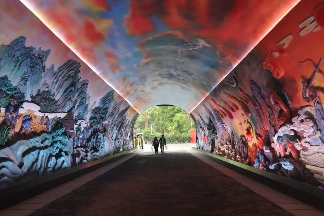 穿過大廳,經(jīng)南門隧道到百花園。百花園內(nèi),海棠、櫻花、杜鵑等花卉爭(zhēng)相開放,奇石、假山、疊瀑景觀映入眼簾,園內(nèi)形成“月月有花開,四季各不同”的景觀,引得游客駐足觀賞。