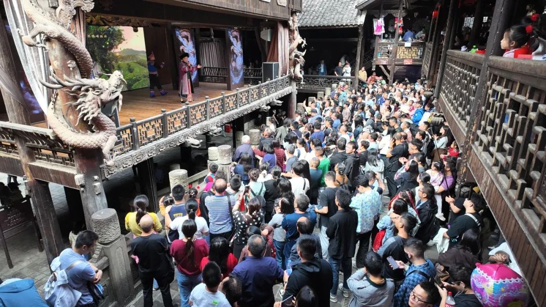 土司城景區(qū)游客在九進(jìn)堂內(nèi)觀看文藝演出