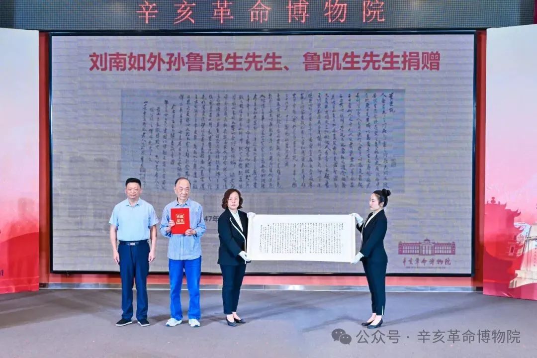 去年下半年以來,在辛亥后裔及社會(huì)各界人士的關(guān)心和支持下,我院已接收文物捐贈(zèng)多次,涉及文物資料10余件(套)。其中,劉南如外孫魯昆生先生、魯凱生先生捐贈(zèng)“1947年張難先手書劉南如撰《苦樂說》書法橫幅”1件(套);張難先外孫倪祖冀先生捐贈(zèng)“張難先題簽贈(zèng)倪文穆1946年上海版《湖北革命知之錄》”1件(套);知名畫家周石峰先生捐贈(zèng)其本人創(chuàng)作的國(guó)畫作品《紅樓晨燈》1件(套),武漢市德森地契博物館捐贈(zèng)“首義路149號(hào)地契”1件(套)。這些捐贈(zèng)進(jìn)一步豐富了我院藏品體系,為我院各項(xiàng)業(yè)務(wù)工作進(jìn)一步高質(zhì)量發(fā)展奠定了堅(jiān)實(shí)基礎(chǔ)。