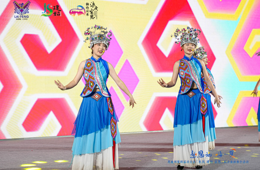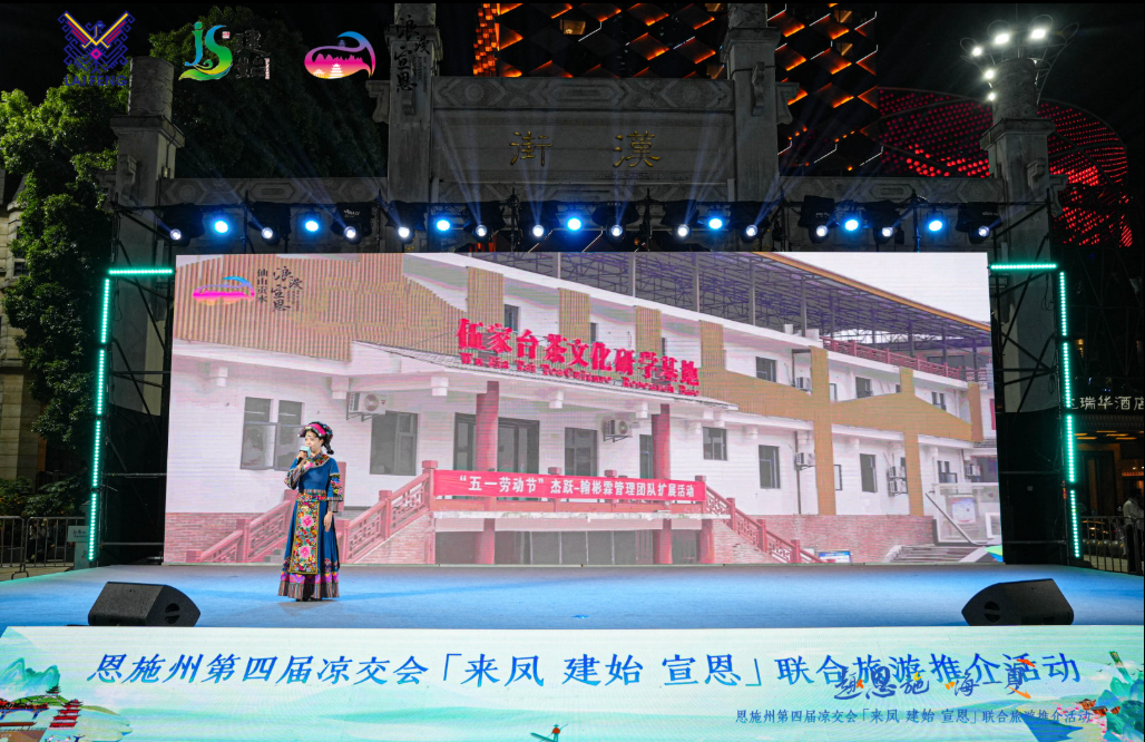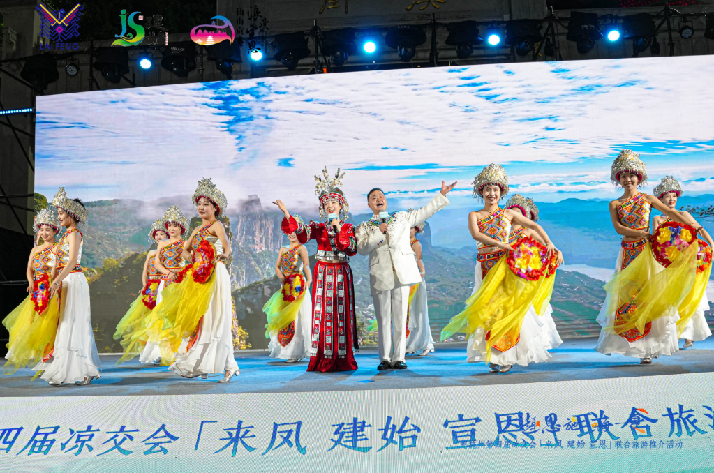 宣恩縣以“浪漫”為關(guān)鍵詞,串聯(lián)仙山貢水旅游區(qū)的璀璨夜景、彭家寨古吊腳樓的土家文化體驗(yàn)、獅子關(guān)水上浮橋的山水美景,以及矅天眼寒武紀(jì)地質(zhì)奇觀。推介官通過(guò)茶香四溢的伍家臺(tái)貢茶文化、野椒園侗族大歌、宣恩耍耍等非遺活動(dòng),展現(xiàn)“中國(guó)民間文化藝術(shù)之鄉(xiāng)”的獨(dú)特魅力。歌伴舞《施南謠》與苗族舞蹈《哩嘞響》則用藝術(shù)語(yǔ)描繪了宣恩的溫情與浪漫。