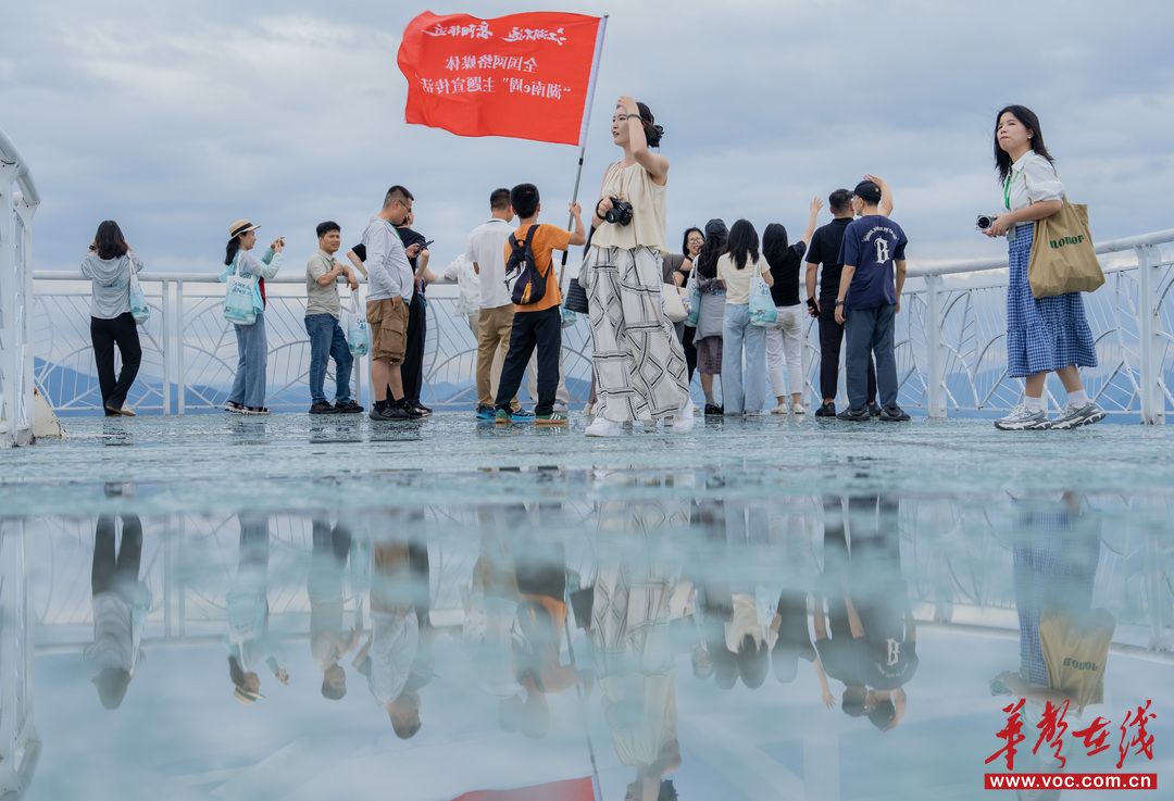 世界最大“三葉草”玻璃高空觀景平臺(tái)“懸崖天眼”傲立牛頭頂,它懸挑58.5米、寬79.3米、高320米,擁有415平方米的載員面積,外形似明珠耀于峰巔。登上觀景臺(tái),眼前是云霧騰繞的天空,向下可俯瞰國(guó)內(nèi)首屈一指的白玉丹霞地貌群落,氣勢(shì)磅礴、壯觀無(wú)比。采訪團(tuán)記者們踏上這絕壁之上的天眼,迎著山風(fēng),對(duì)著無(wú)人機(jī)揮手吶喊,歡聲笑語(yǔ)與壯麗景色交融,繪就絕美畫(huà)卷。