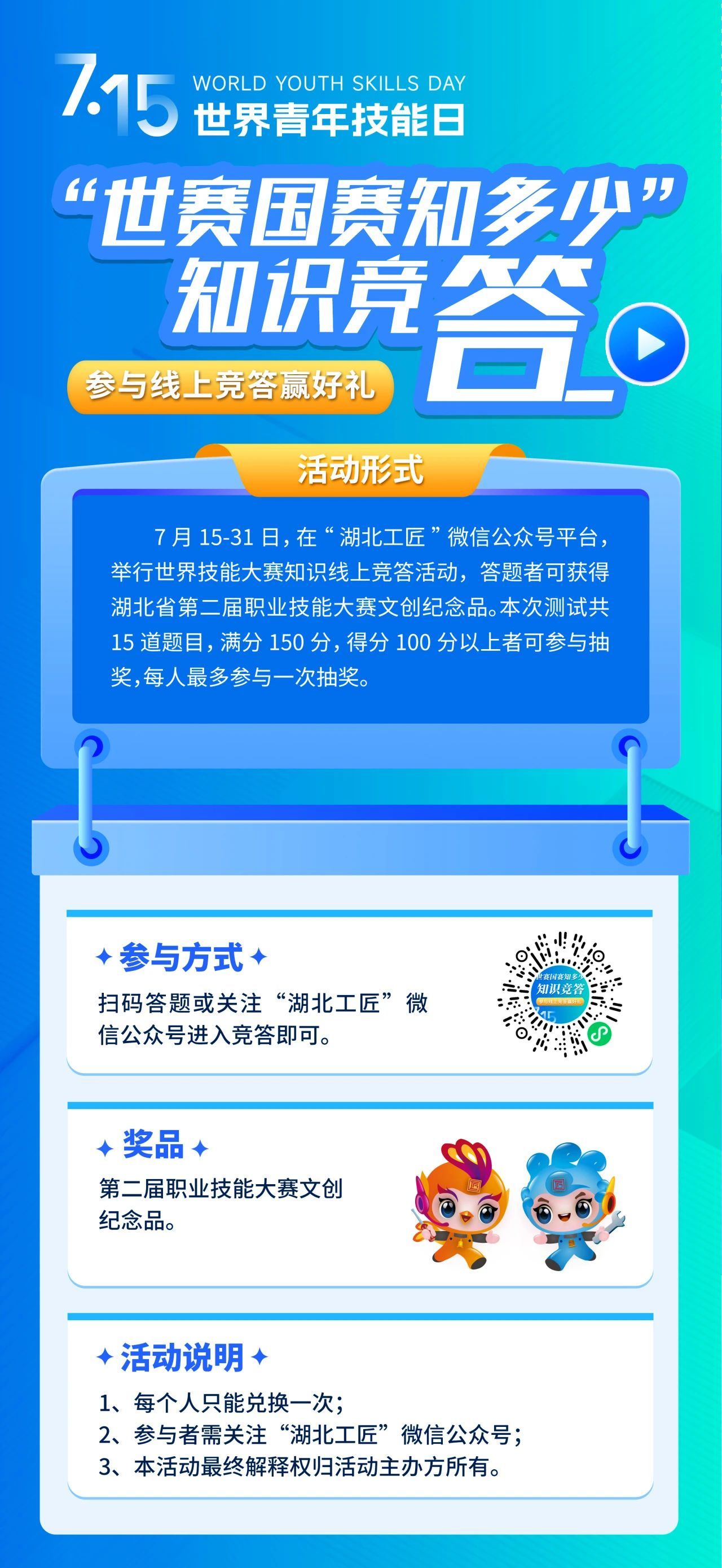 世界技能大賽和全國(guó)技能大賽知識(shí)線上競(jìng)答火熱上線,微信掃描活動(dòng)二維碼進(jìn)入答題小程序。完成15道題并得分≥100分,即可抽取湖北省第二屆職業(yè)技能大賽限量版文創(chuàng)紀(jì)念品,每人限答一次,越早參與中獎(jiǎng)率越高!