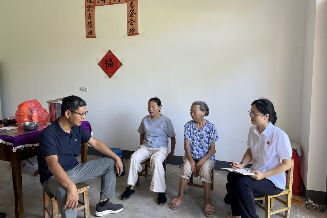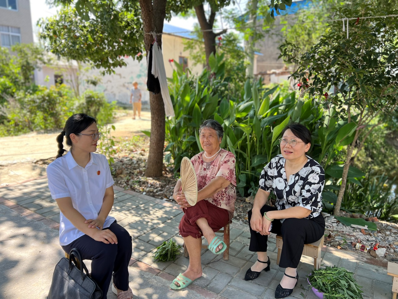 在村路邊的大樹底下,詹伍權主席與李舒庭長遇到一位乘涼的老奶奶,兩人主動上前噓寒問暖,詳細詢問老人的身體狀況、家庭生活及養(yǎng)老保障情況,叮囑老人注意夏季防暑,并結合老年人權益保障法,告知其在贍養(yǎng)、醫(yī)療等方面的合法權益及維權途徑。