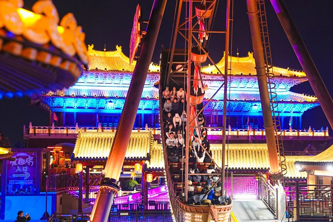 旋轉(zhuǎn)木馬《嘯騷千里》、過山車《龍騰鼓舞》、海盜船《神舟出?!贰w天轉(zhuǎn)盤《鳳舞九天》、道遙花燈《花燈初上》,大宋·皇家樂園,更適合中國寶寶的中國風(fēng)游樂園!