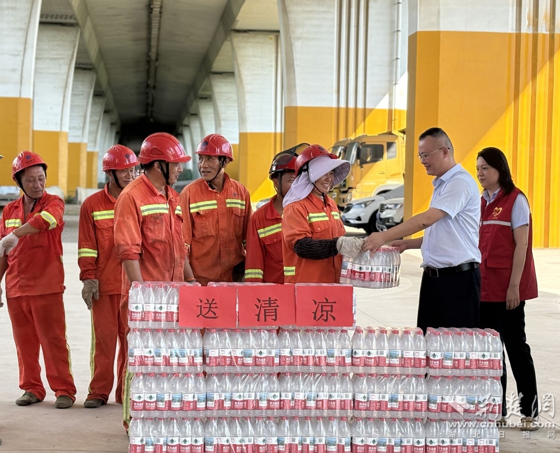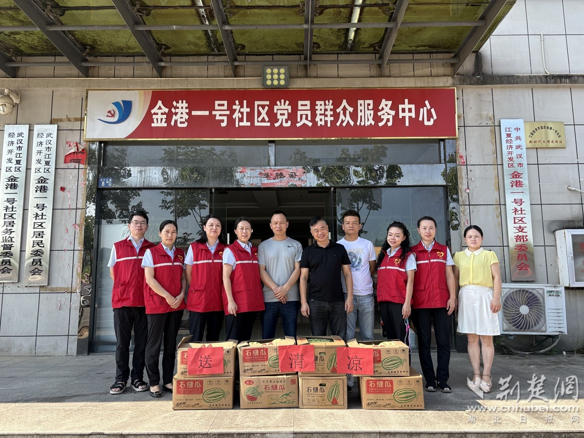 上午9時(shí),支部黨員代表一行首先來到金港一號(hào)社區(qū)黨員服務(wù)中心,將新鮮西瓜送到社區(qū)工作者手中。隨后,他們前往湖北高開公司武漢分區(qū)施工一線,為冒酷暑作業(yè)的工人送去礦泉水、藿香正氣液等防暑物資。在施工現(xiàn)場(chǎng),黨員們?cè)敿?xì)了解工程進(jìn)展和防暑措施落實(shí)情況,叮囑企業(yè)科學(xué)安排作息,確保安全生產(chǎn)與職工健康“雙保障”。