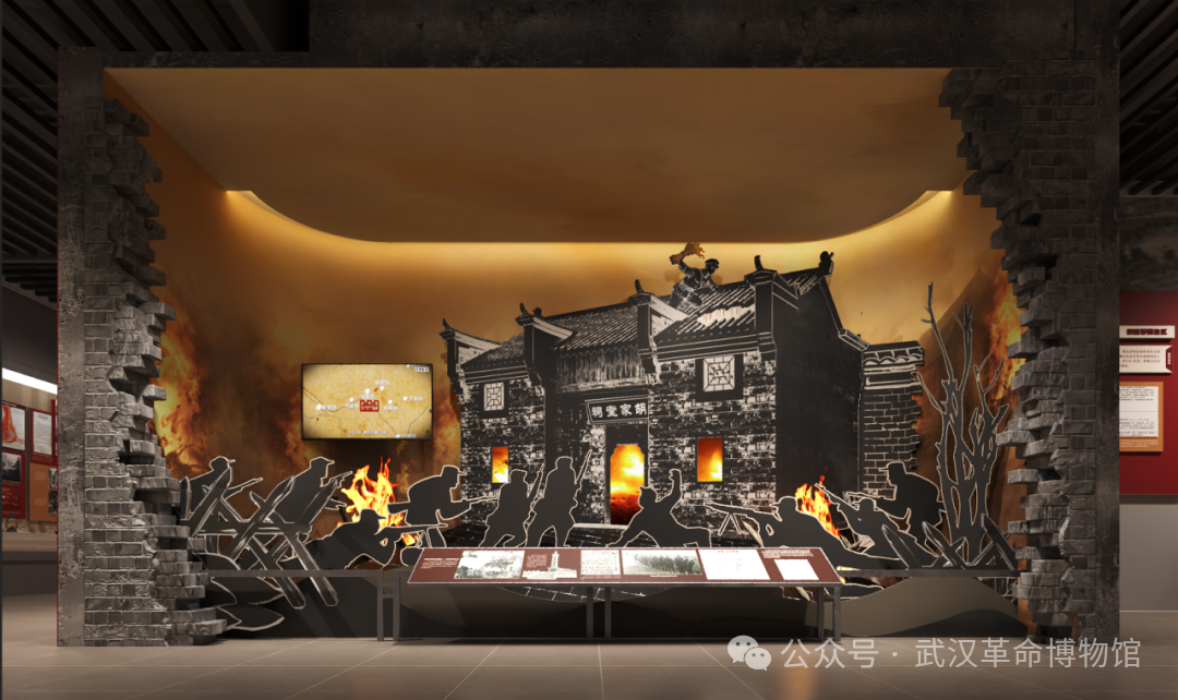 “火燒胡家祠堂”采用藝術(shù)場(chǎng)景+視頻結(jié)合的方式,定格侏儒山戰(zhàn)役中的胡家臺(tái)戰(zhàn)斗,生動(dòng)刻畫(huà)出百姓毀家紓難與新四軍第五師并肩作戰(zhàn)的英勇精神,使觀眾身臨其境地感受到勝利來(lái)之不易。