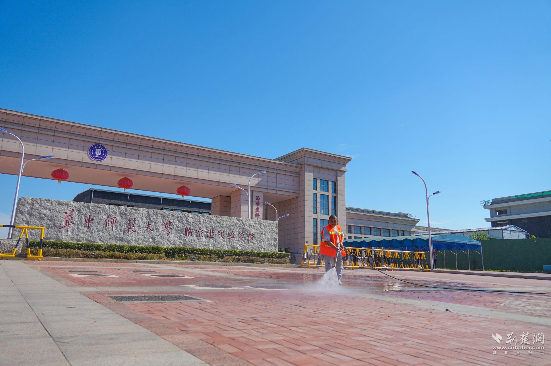 校園周邊環(huán)境的整潔同樣關(guān)系到孩子們的安全與健康。8月29日清晨,在華中師范大學(xué)臨空港實驗學(xué)校門口,7名環(huán)衛(wèi)工人配合一輛高壓沖洗車,正對人行道、護欄、公交站臺進行細(xì)致清潔,地磚縫隙間的落葉、油漬也不放過。