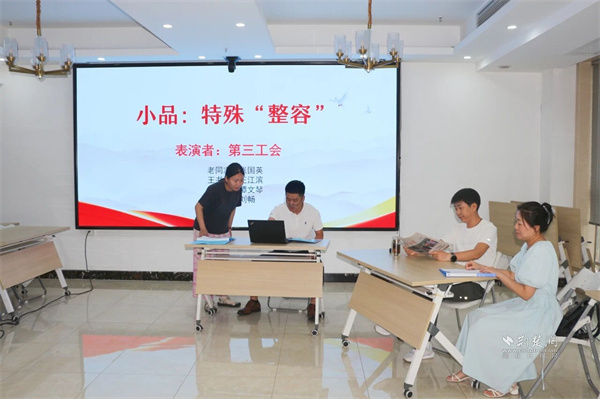 才藝展示團(tuán)隊賽環(huán)節(jié),《心靈美容院》《“照鏡子 正衣冠”研討會》《特殊整容》等精彩節(jié)目輪番上演。黨群干部通過小品、朗誦、合唱等多元形式,生動呈現(xiàn)在思想引導(dǎo)、作風(fēng)建設(shè)和團(tuán)隊凝聚中的實踐與思考,剖析了工作中的“痛點”“堵點”,映射出黨群工作者直面問題的工作實效。