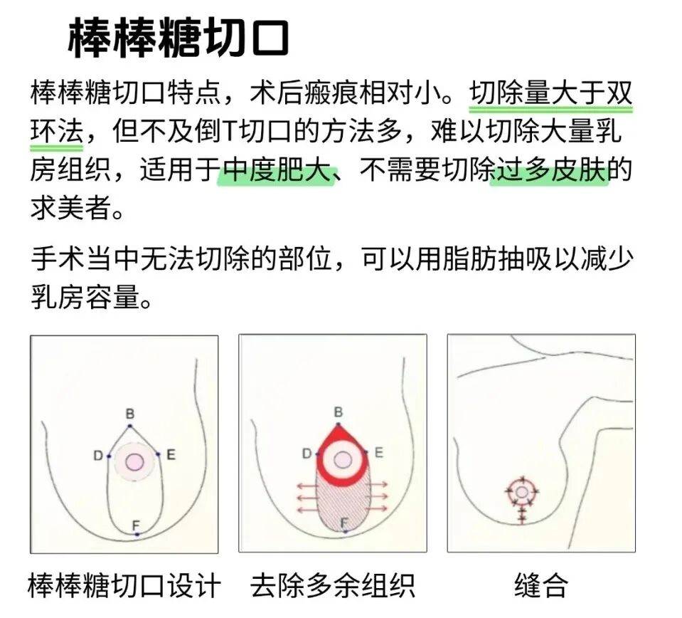 這是一種經(jīng)典的巨乳縮小術(shù)式。通過(guò)精心設(shè)計(jì),去除多余的組織、脂肪和皮膚,并將乳頭乳暈復(fù)合體移位至新高點(diǎn),最后縫合為一個(gè)圍繞乳暈的“棒棒糖”狀或垂直短瘢痕切口。